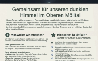 Unser neuer KEM-Folder „LICHT AUS – STERNE AN“ ist da!Er zeigt, warum die natürliche Dunkelheit im Oberen Mölltal so wertvoll ist und mit welchen einfachen Maßnahmen jede*r Einzelne dazu beitragen kann, die Nacht zu schützen und den faszinierenden Sternenhimmel unserer Region wieder sichtbarer zu machen. Der Folder erklärt verständlich, was Lichtverschmutzung bedeutet, welche Auswirkungen [...]