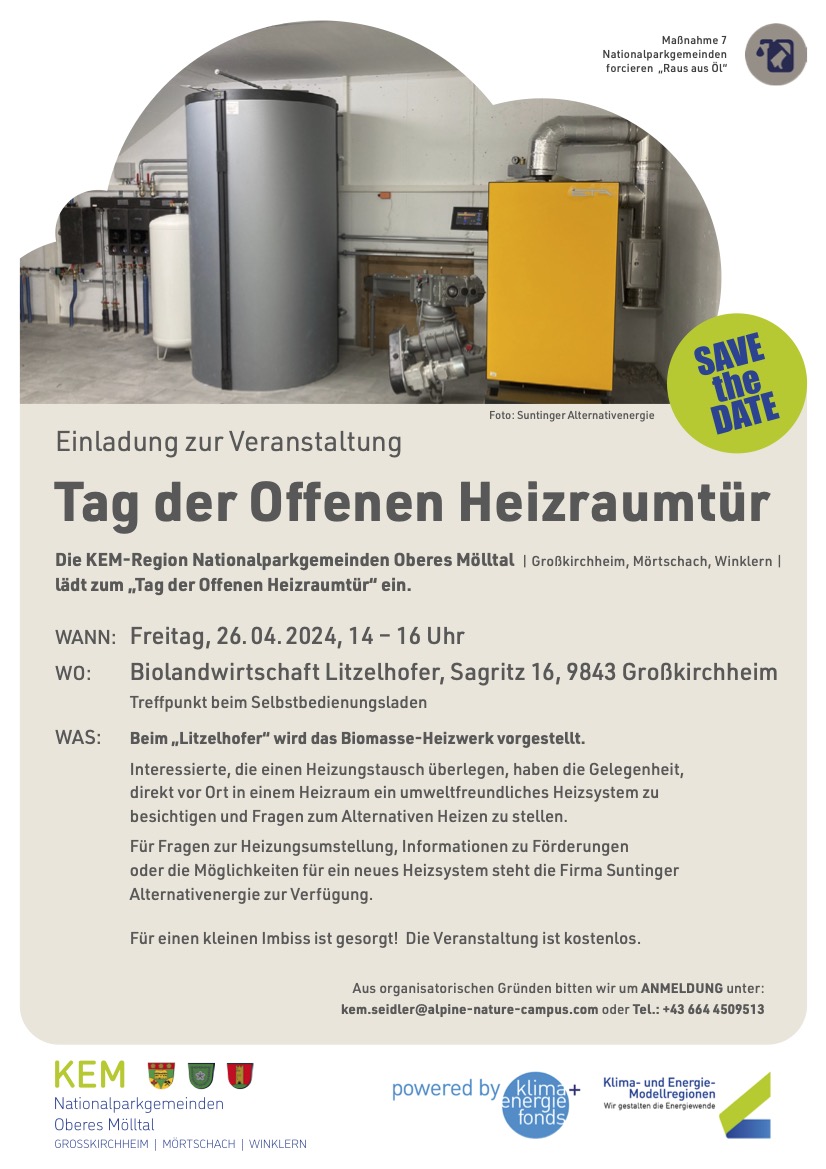 Einladung zur „Tag der Offenen Heizraumtür“, 26. 4. 2024, 14. – 16.00, Biolandwirtschaft Litzelhofer, Großkirchheim