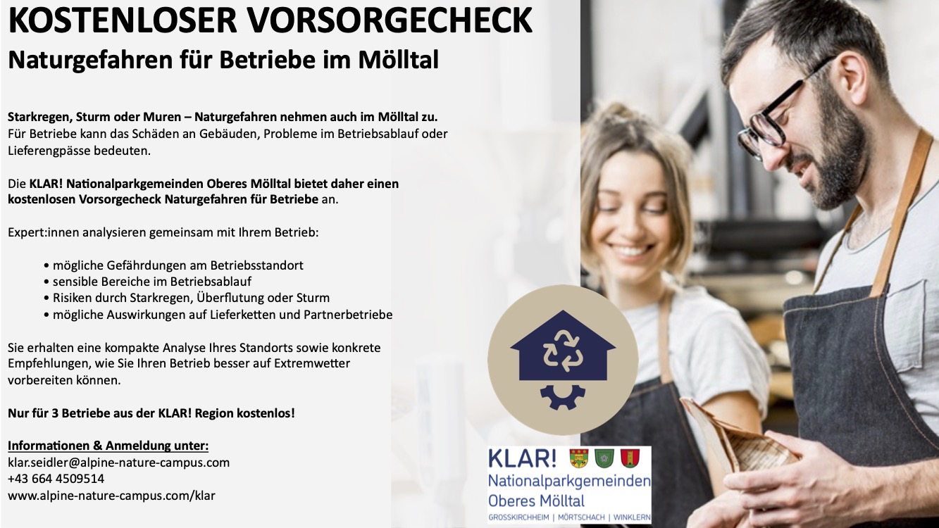 Die KLAR! Nationalparkgemeinden Oberes Mölltal bieten deshalb einen kostenlosen Vorsorgecheck Naturgefahren für Betriebe an – aber nur für drei Betriebe in der Region.