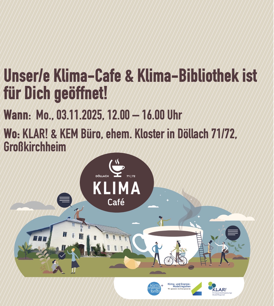 Du willst über unser KLAR! & KEM Maßnahmen informiert werden oder vielleicht selbst bei einer KLAR! oder KEM Maßnahme der Nationalparkgemeinden Oberes Mölltal mitmachen? Dann freuen wir uns über Deinen Besuch in unserem KLIMA CAFE und in der KLIMA-BIBLIOTHEK! Wann: MONTAG, 03. November 2025, von 12.00 – 16.00 Uhr Wo: in unserem KLAR! und KEM-Büro […] |