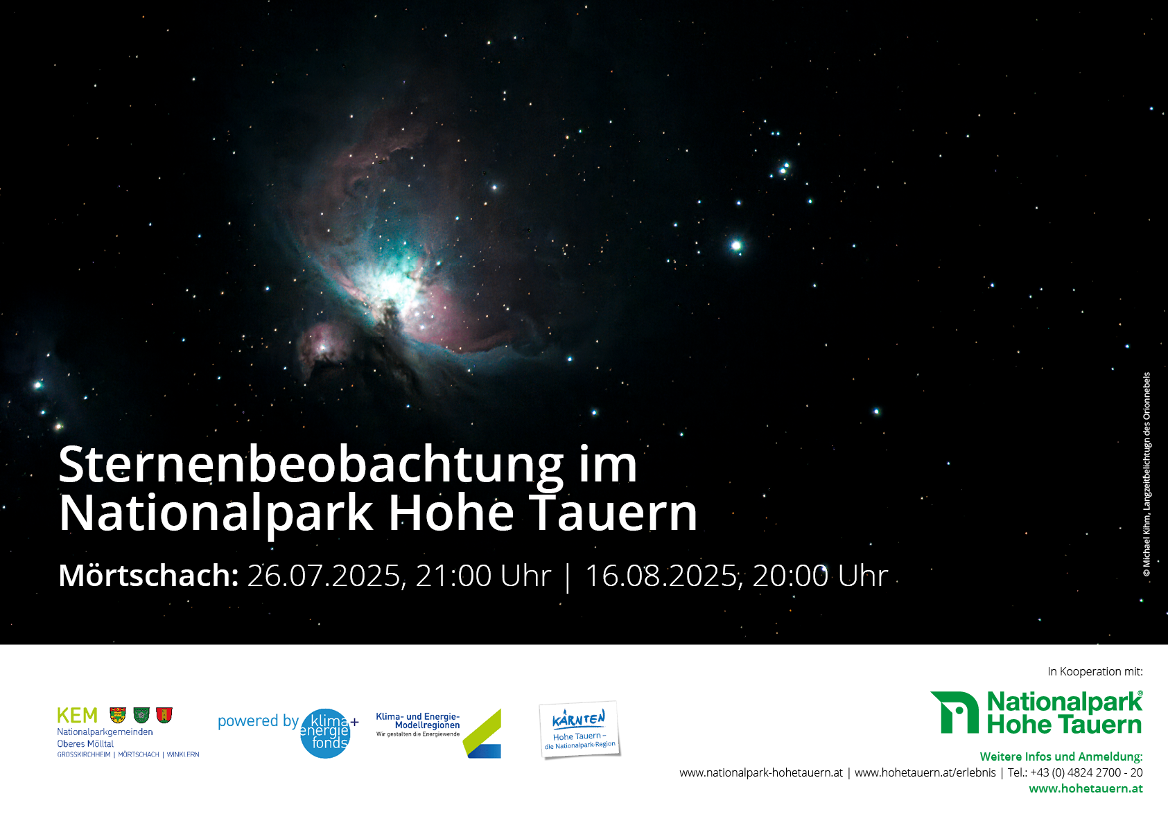 Find out moreIm Rahmen unserer KEM-Maßnahme „Sternenregion Nationalparkgemeinden – Verringerung von Lichtsmog“ haben wir – gemeinsam mit unserem Kooperationspartner Nationalpark Hohe Tauern – für alle Interessierten eine Sternenhimmel-Tour im Astentalgeplant. Bei dieser nächtlichen, von NPHT-Ranger*innen geführten Sternenhimmel-Tour soll der einzigartige Sternenhimmel in unserer KEM-Region mit allen Sinnen erlebbar gemacht werden. Darüber hinaus gibt es Wissenswertes zu erfahren, warum [...]
